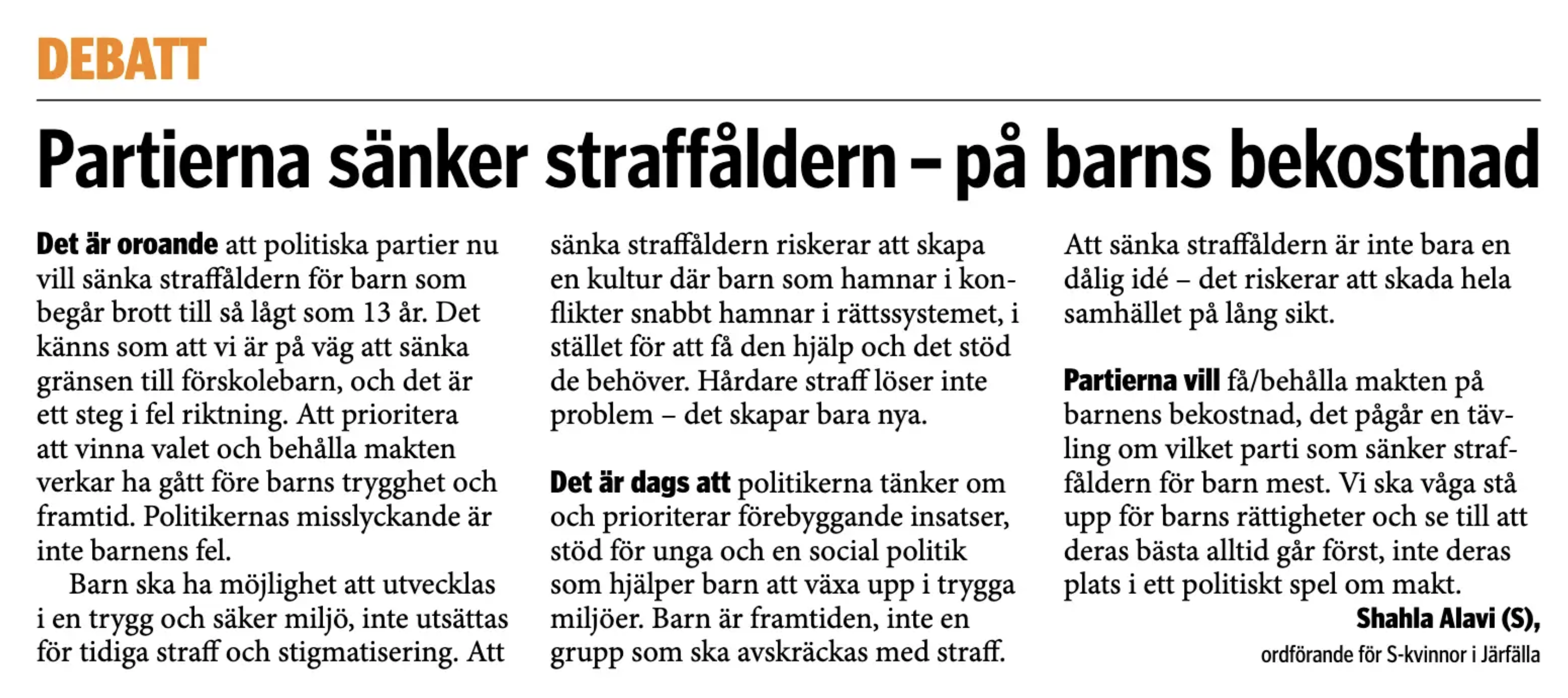 I en debattartikel i Mitt i Järfälla vecka 29 skrev S-kvinnor i Järfälla att partier som vill sänka straffmyndighetsåldern gör det ”på barns bekostnad”. Det är en djupt missledande beskrivning som vittnar om en föråldrad syn på brott och straff, en syn som möjligtvis fungerade på 1950- och 60-talet, men som inte har någon bäring i dagens verklighet.