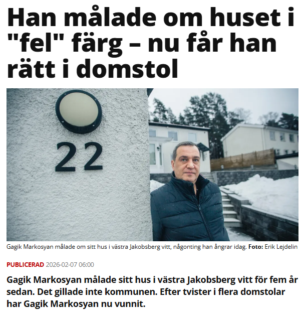I det här fallet drev Moderaterna och Socialdemokraterna linjen att Gagik Markosyan skulle tvingas återställa den rökgula fasadfärgen på sitt eget hus efter att han målat om till en ljusare nyans. Detta trots att liknande färgsättningar redan förekomer i området.